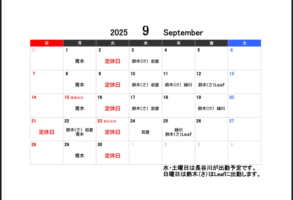 遅くなり申し訳ございません、9月の休み予定のお知らせします。